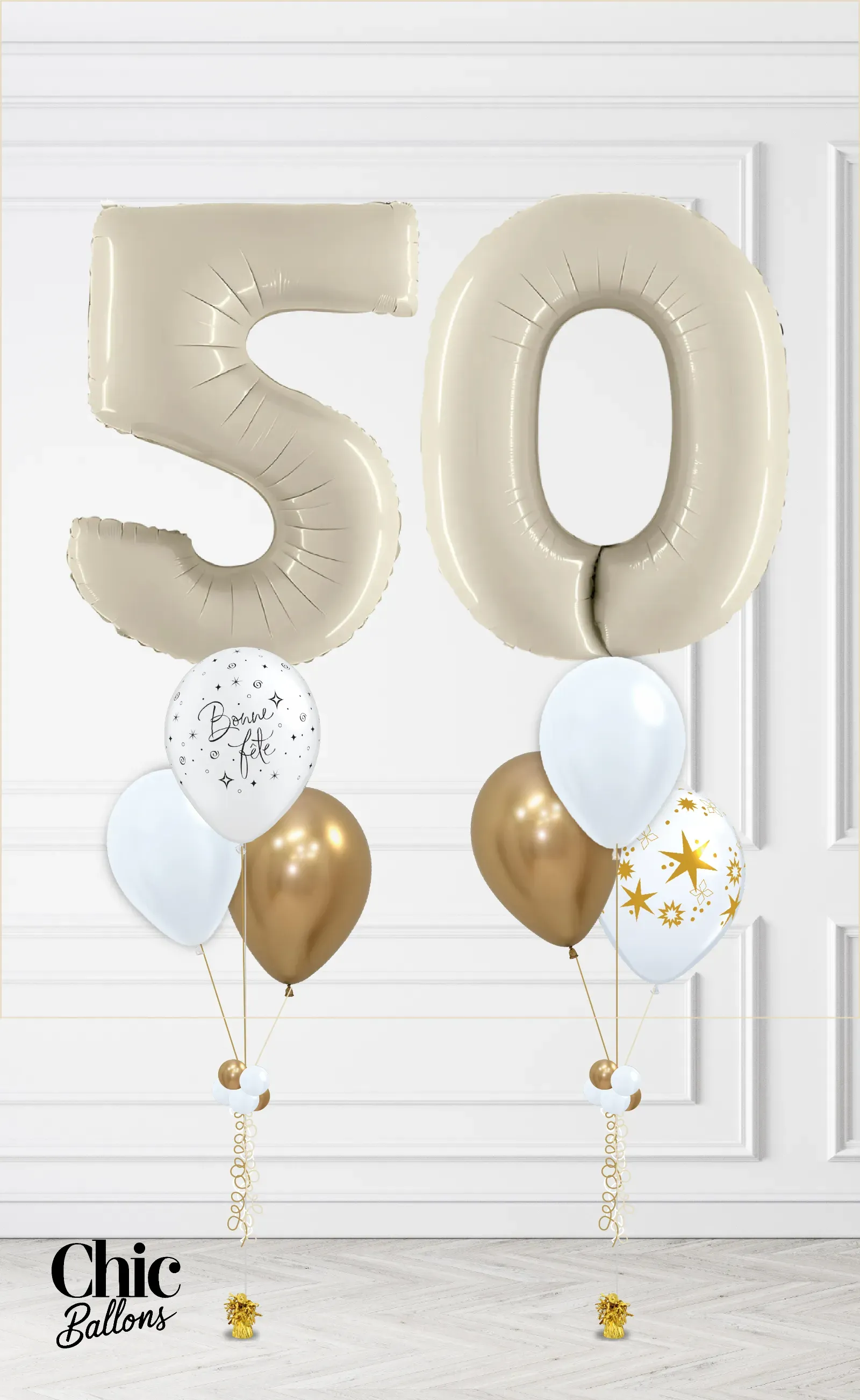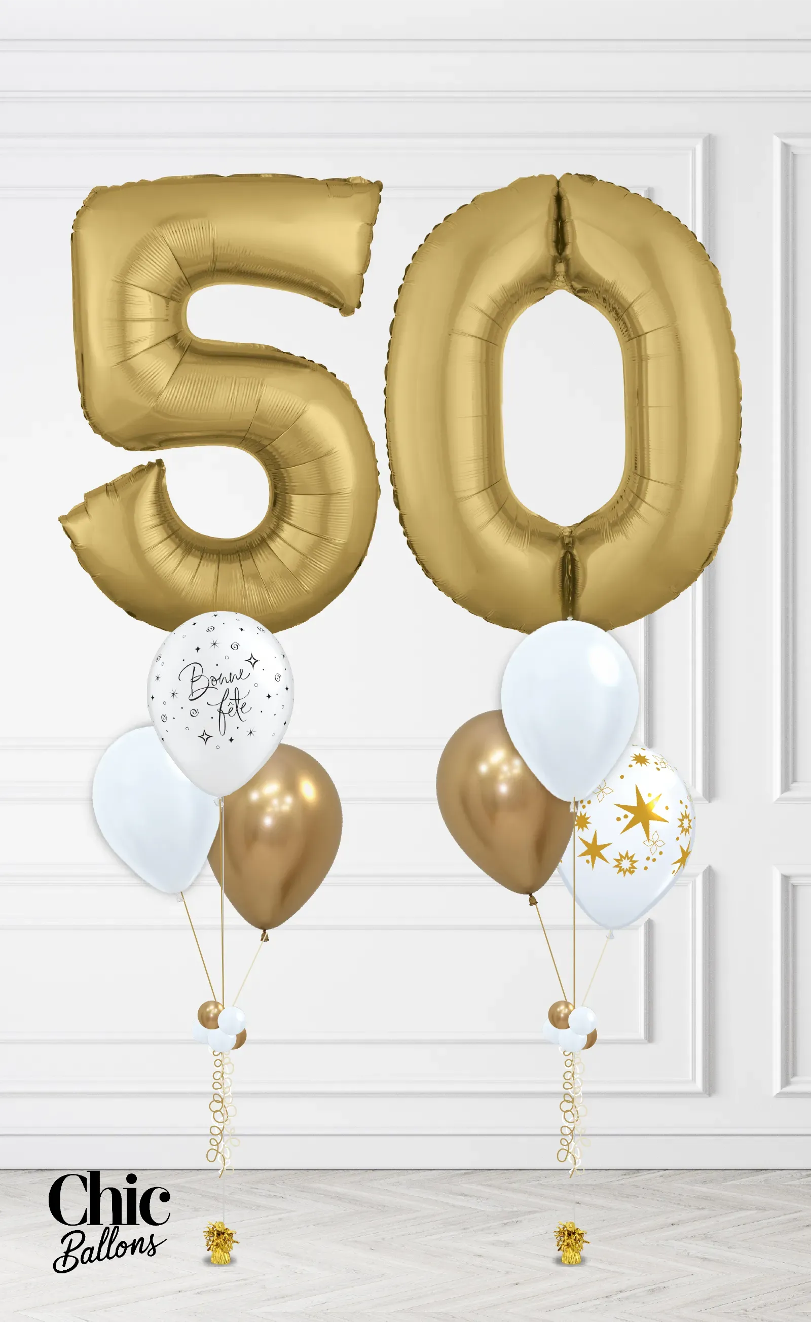 Apportez une touche de sophistication à votre événement avec cet ensemble de deux bouquets élégants dans les teintes de doré et blanc. Chaque bouquet comprend un chiffre de votre choix pour marquer un âge ou une année spéciale, accompagné de trois ballons latex dans des tons de blanc et d’or. Idéal pour célébrer des anniversaires ou des moments mémorables avec une ambiance chic et lumineuse !