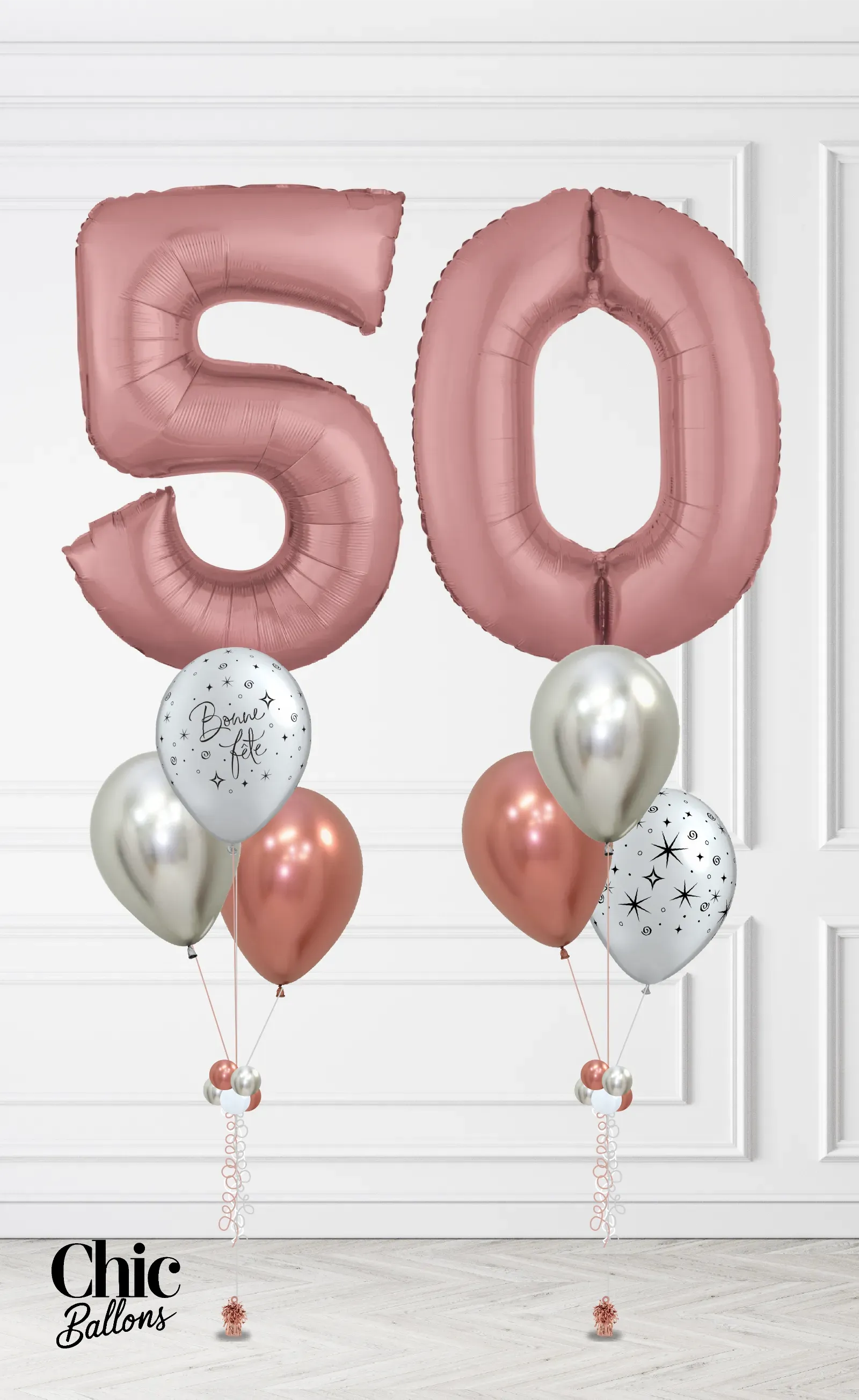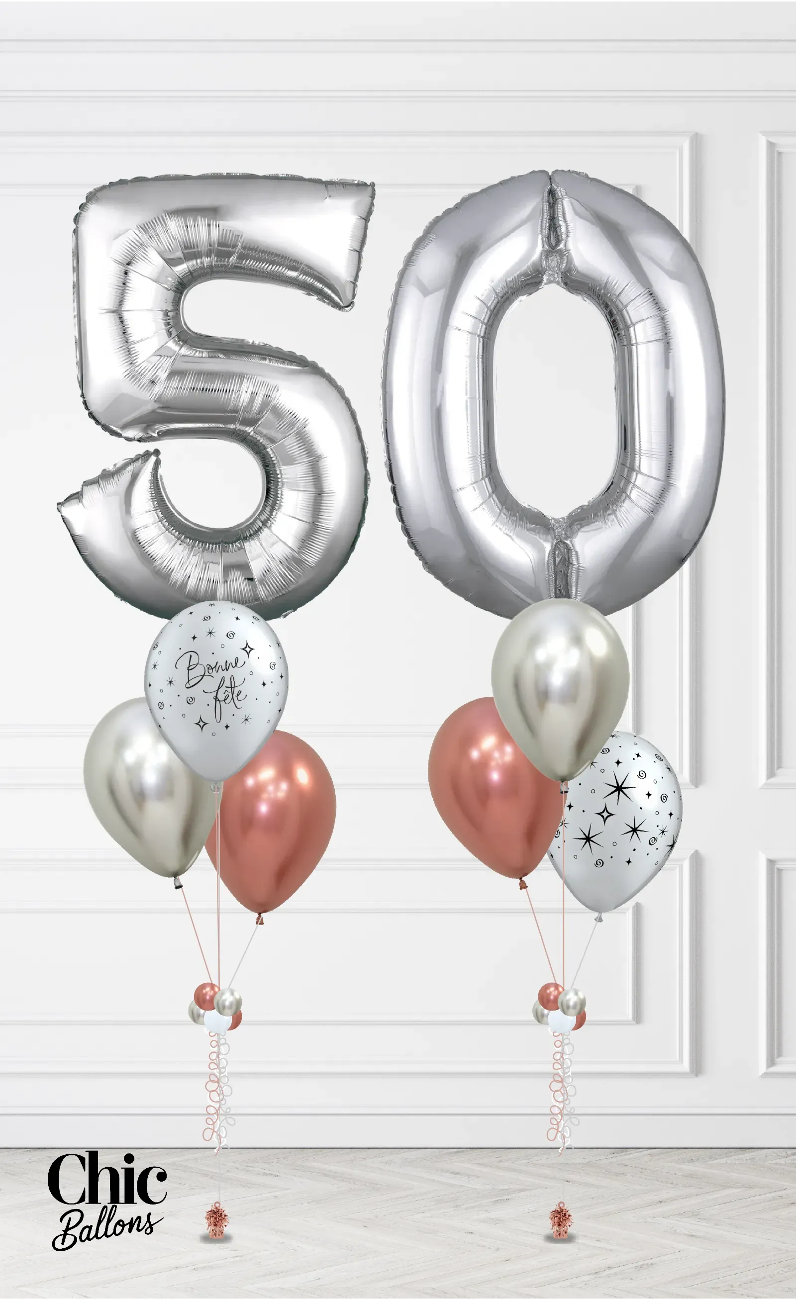 Apportez une touche de luxe à votre événement avec cet ensemble de deux bouquets dans les teintes sublimes de rose gold métallisé et argent. Chaque bouquet comprend un chiffre de votre choix pour personnaliser l'occasion, accompagné de trois ballons latex assortis dans ces nuances élégantes et modernes. Parfait pour une fête d'anniversaire ou toute célébration nécessitant une note de raffinement et de brillance !