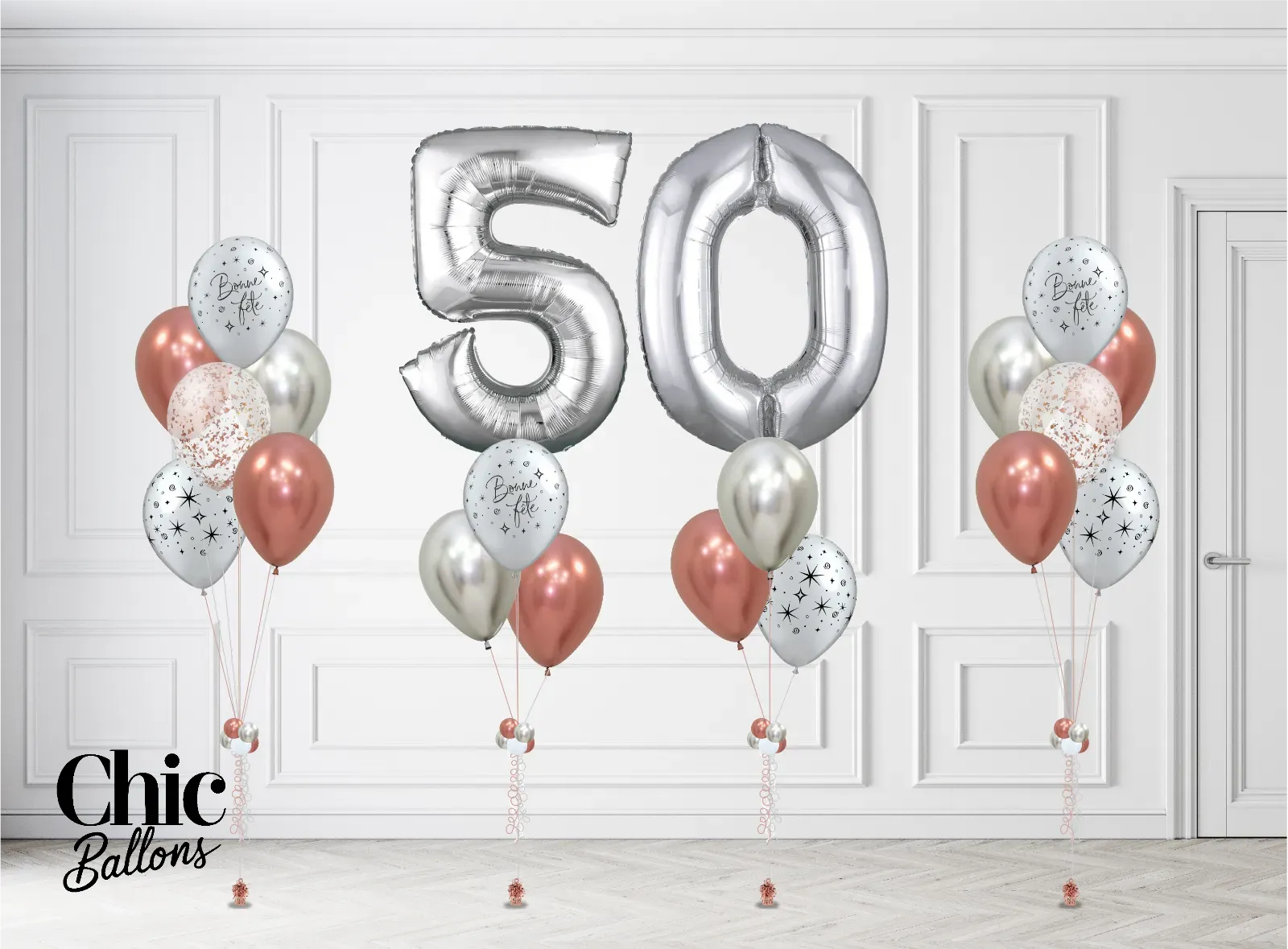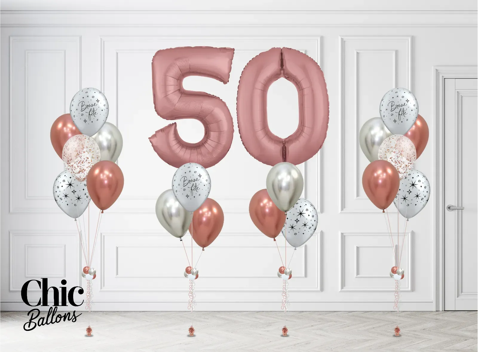 Ajoutez une touche spectaculaire et féminine à votre événement avec cet ensemble de 4 bouquets de ballons parfaitement coordonnés. Il comprend deux bouquets de 5 ballons dans des teintes élégantes de rose gold métallisé et argent, chacun rehaussé d’un ballon à paillettes rose gold scintillant. À cela s’ajoutent deux bouquets avec des chiffres de votre choix (parmi 1 à 9 ou tout autre âge), chacun accompagné de 3 ballons latex assortis dans les mêmes teintes. Un choix idéal pour une célébration chic, raffinée et mémorable !
