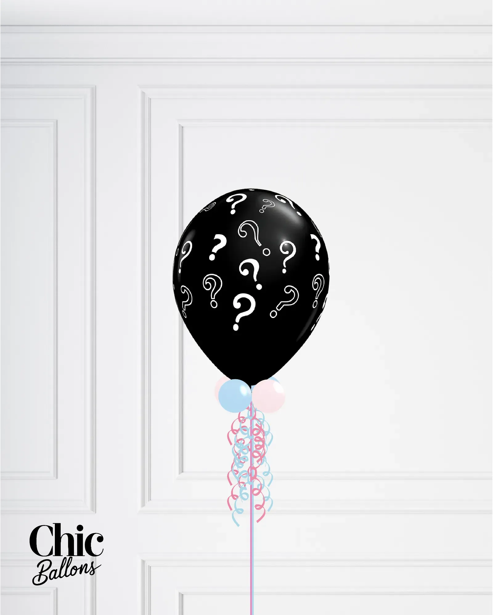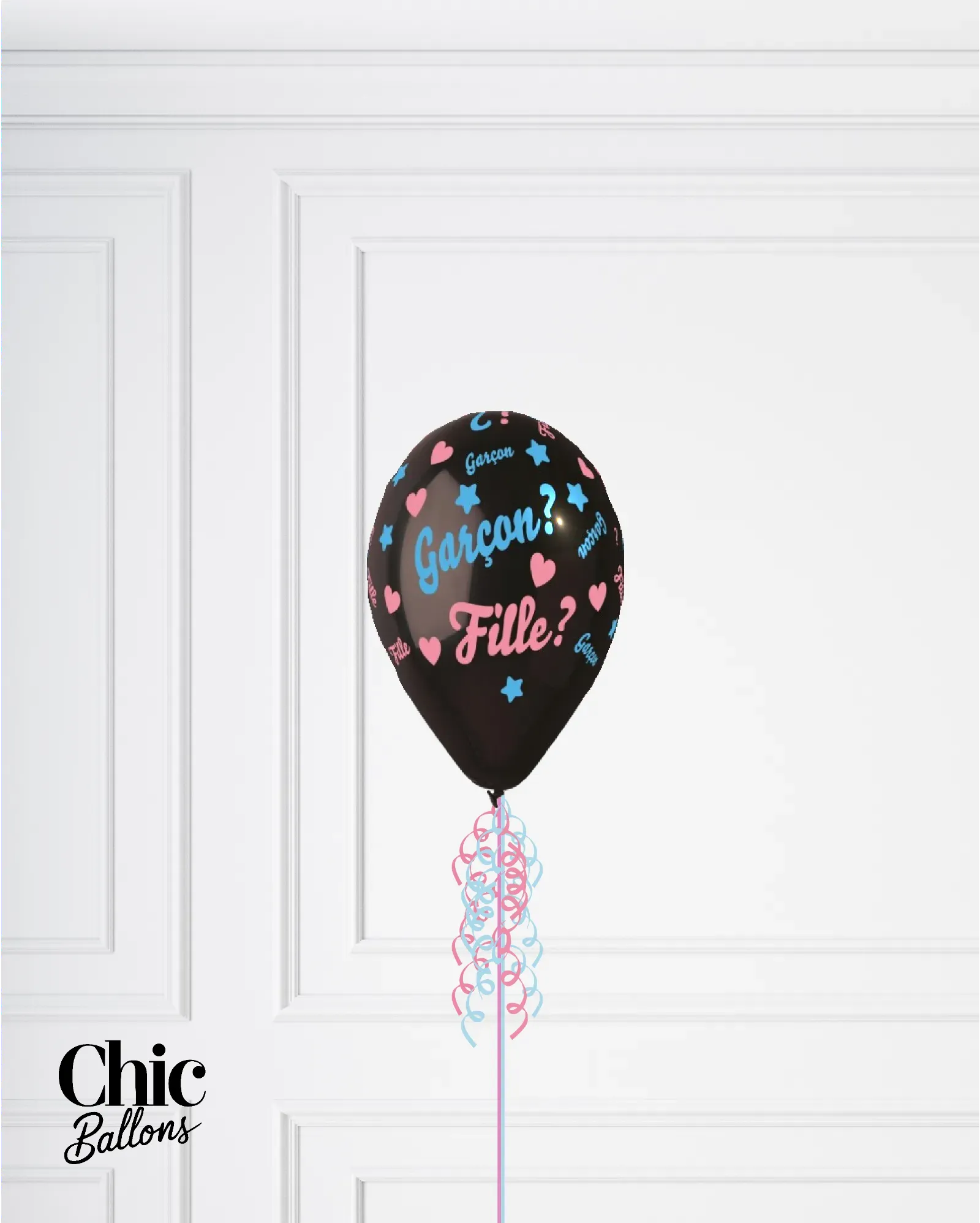 Surprenez vos invités avec notre ballon de révélation de sexe noir de 16 pouces, orné de points d'interrogation mystérieux. À l'intérieur, des paillettes rose ou bleu apportent une touche magique à la révélation. Ce bouquet est complété par quatre ballons de 5 pouces à la base du ballon, ajoutant une touche festive et colorée. Une manière spectaculaire et élégante de dévoiler le sexe de bébé à vos proches !
