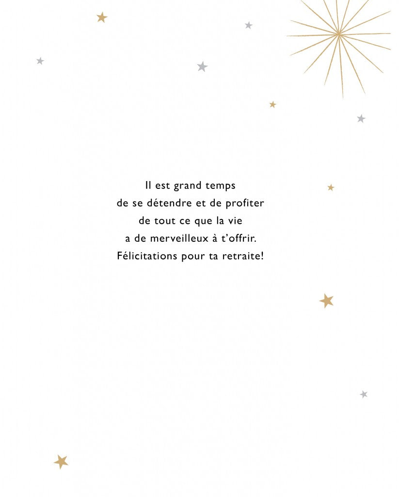 TEXTE À L’INTÉRIEUR: IL EST GRAND TEMPS DE SE DÉTENDRE ET DE PROFITER DE TOUT CE QUE LA VIE A DE MERVEILLEUX À T’OFFRIR. FÉLICITATIONS POUR TA RETRAITE!