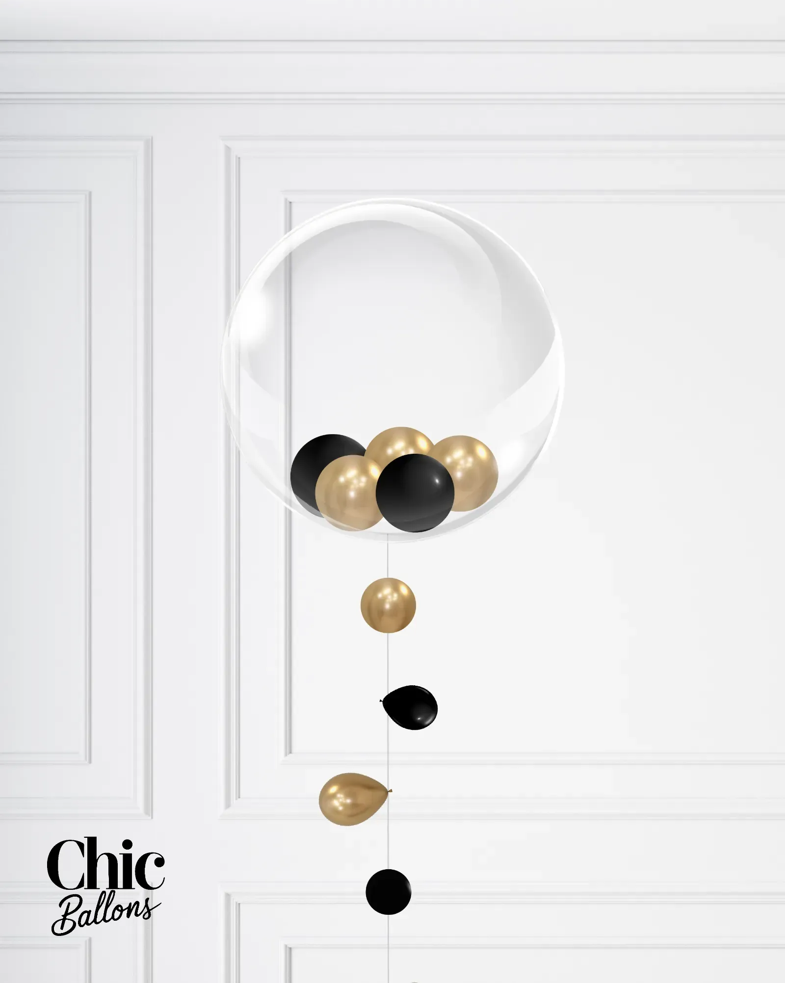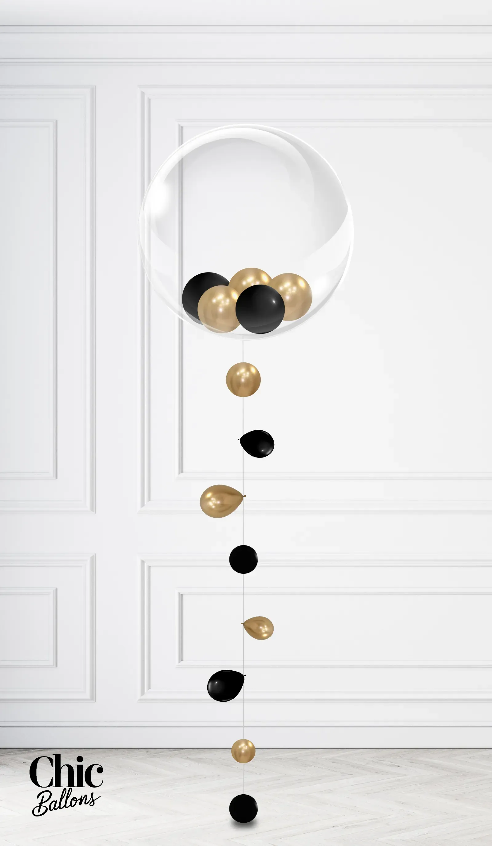 Ajoutez une touche de sophistication à votre événement avec ce ballon de 24 pouces transparent, rempli de ballons de 5 pouces à l'intérieur pour un effet unique et dynamique. Inclut des ballons de 5 pouces dans des teintes élégantes de or et noir créant une ligne décorative raffinée qui descend jusqu'à la base, apportant une ambiance chic et moderne à votre célébration. Parfait pour des anniversaires, des événements professionnels ou tout autre moment spécial, il ajoutera une touche mémorable et impressionnante à votre décoration.