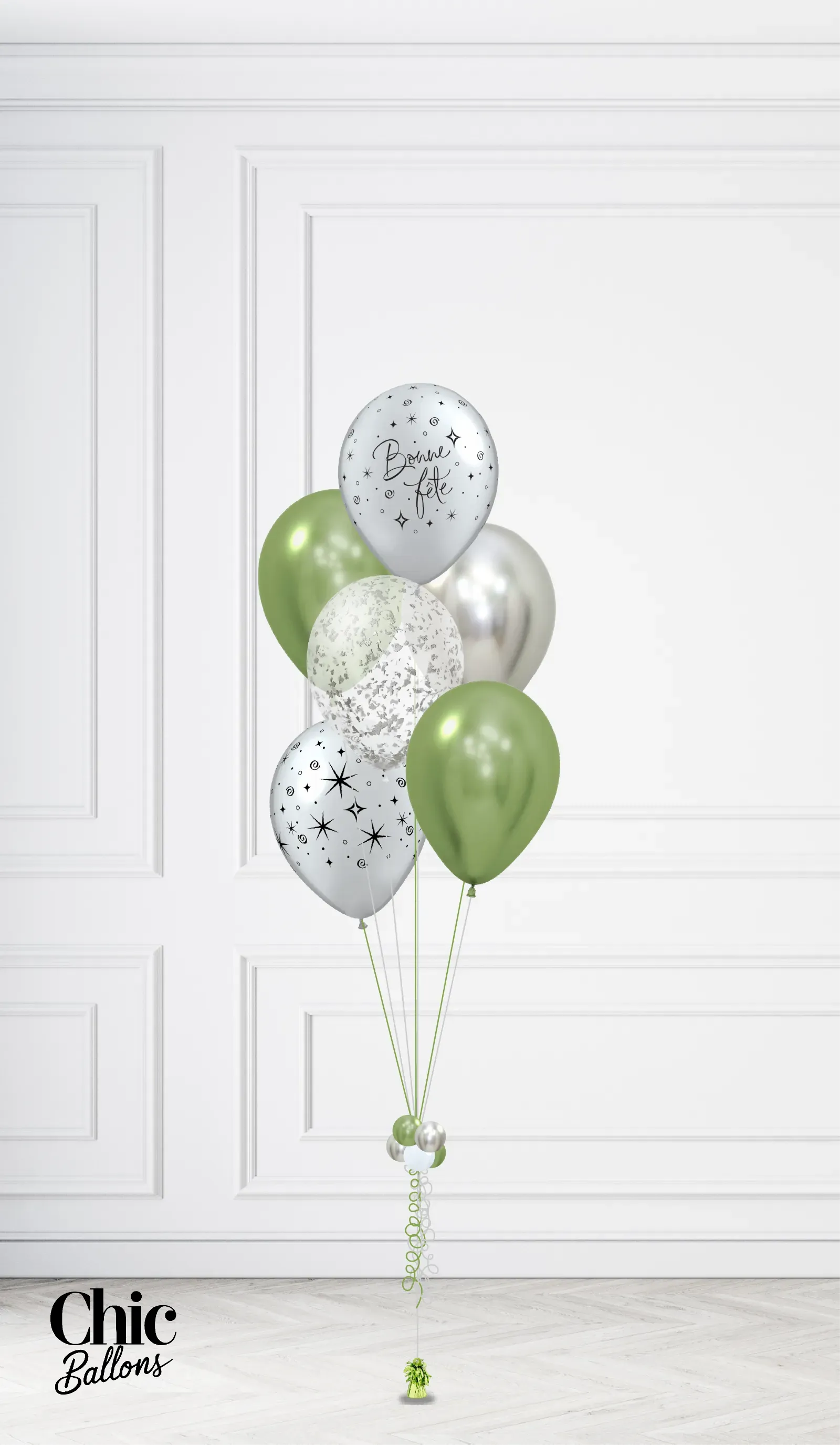 Apportez une touche vibrante et élégante à votre événement avec ce bouquet de 5 ballons dans les teintes de vert métallisé et argent métallisé. Ce bouquet est complété par un ballon paillettes argent, ajoutant une brillance scintillante à l'ensemble. Parfait pour une célébration chic et raffinée !