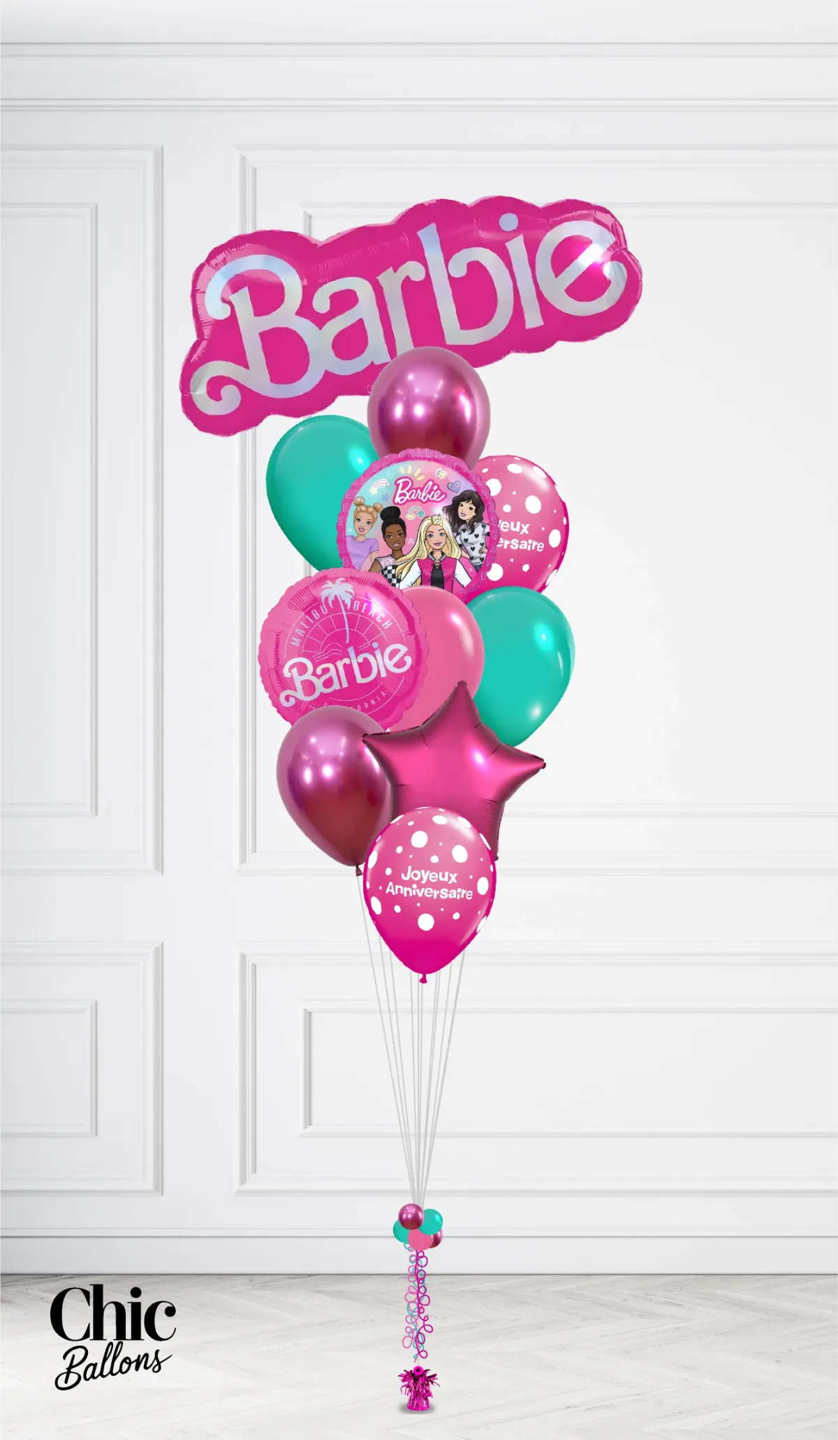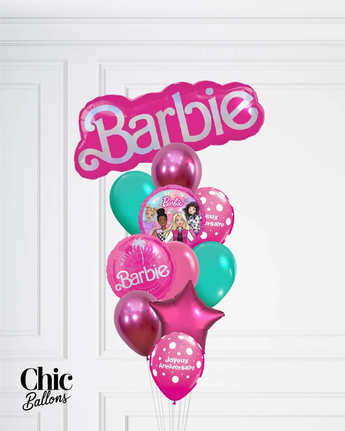 Faites briller la fête avec notre bouquet Barbie ! Un bouquet vibrant et glamour, selon la taille sélectionnée, il peut être composé d'un gros ballon rose fuchsia avec l'inscription "Barbie", accompagné d'un ballon 18" avec les personnages de Barbie, un autre ballon 18" avec l'inscription "Barbie", et une étoile fuchsia 18". Le tout est complété par des ballons latex dans les teintes de fuchsia, rose et turquoise, apportant une touche joyeuse et pétillante. Vérifiez ce qui est inclus ou non dans chaque taille de bouquet.