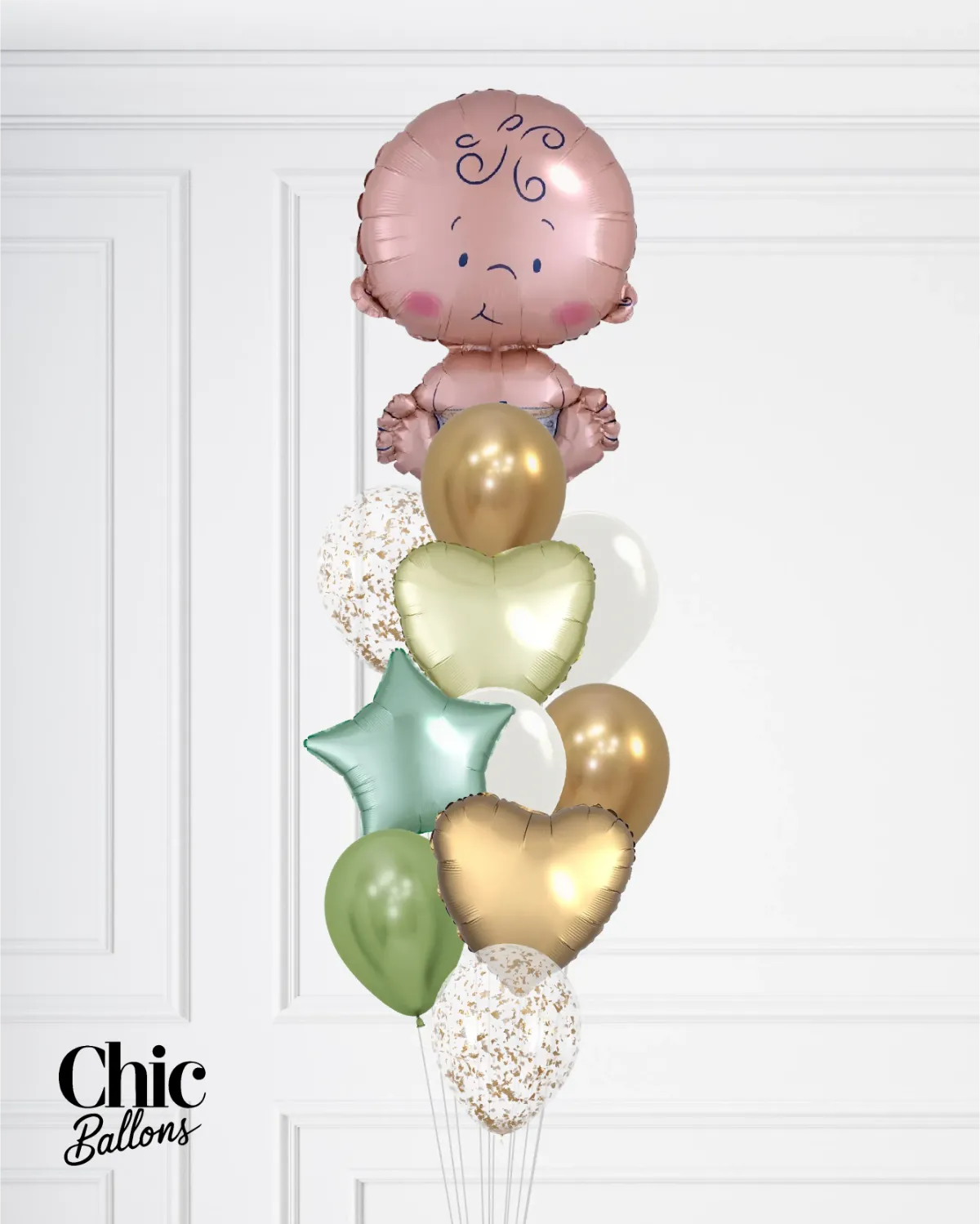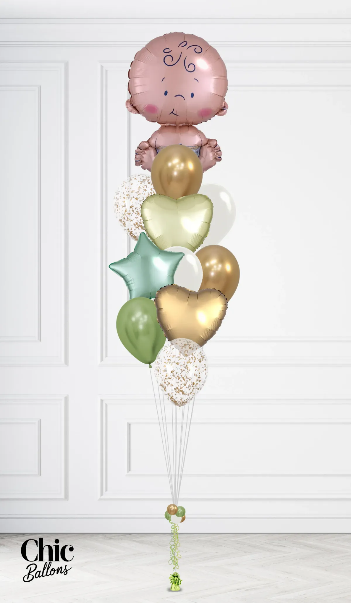 Célébrez l'arrivée du bébé avec un bouquet éclatant et joyeux, parfait pour une occasion spéciale ! Selon la taille sélectionnée, il peut inclure un gros ballon bébé sur le dessus, accompagné de deux ballons 18" en forme de cœur et un ballon 18" en forme d'étoile. Le bouquet est composé de teintes douces de vert, avec des touches de paillettes or, créant une atmosphère élégante et accueillante. Idéal pour fêter l'arrivée du bébé, quel que soit son genre ! Vérifiez ce qui est inclus ou non dans chaque taille de bouquet.