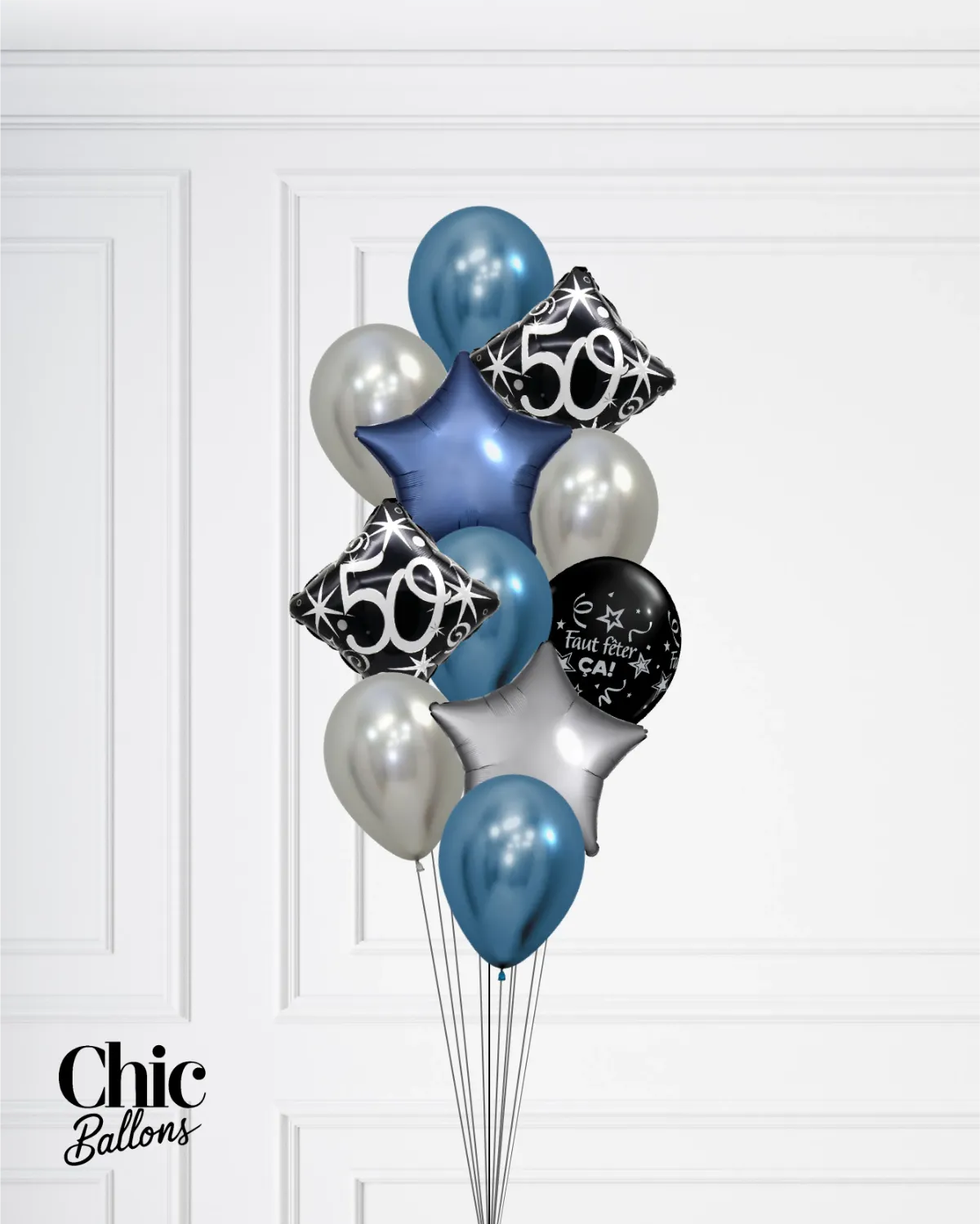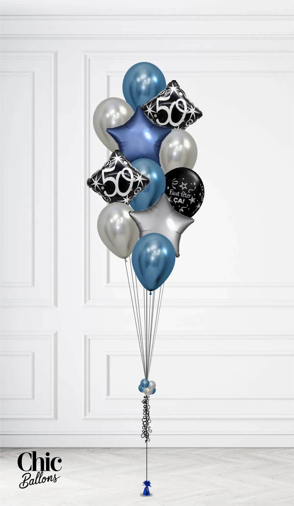 Offrez à votre événement une ambiance moderne et élégante avec ce bouquet aux teintes argent métallisé et bleu métallisé. Selon la taille sélectionnée, il peut inclure deux ballons avec l'âge de votre choix parmi 18, 30, 40, 50, 60, 70, 80 ans ou un ballon "Bonne fête", ainsi qu’une étoile argent métallisée de 18" et une étoile bleue métallisée. Ce bouquet chic et contemporain sera l’atout parfait pour marquer un moment spécial. Vérifiez ce qui est inclus ou non dans chaque taille de bouquet.