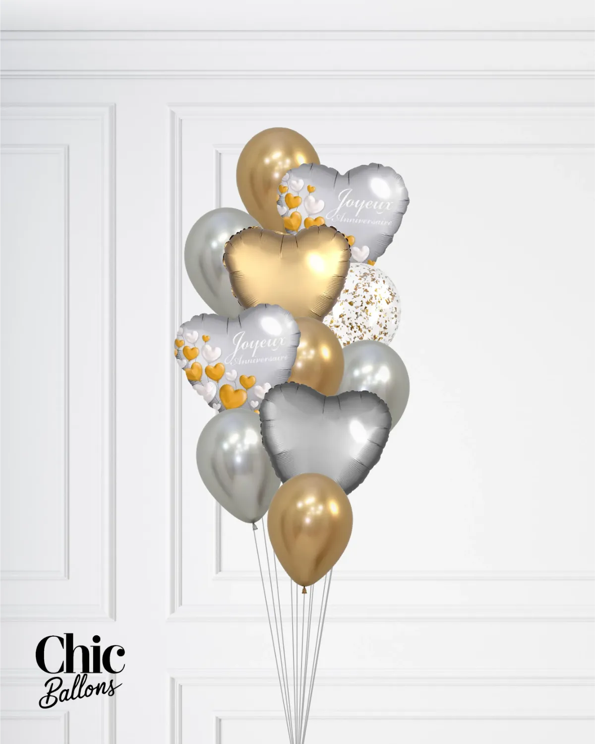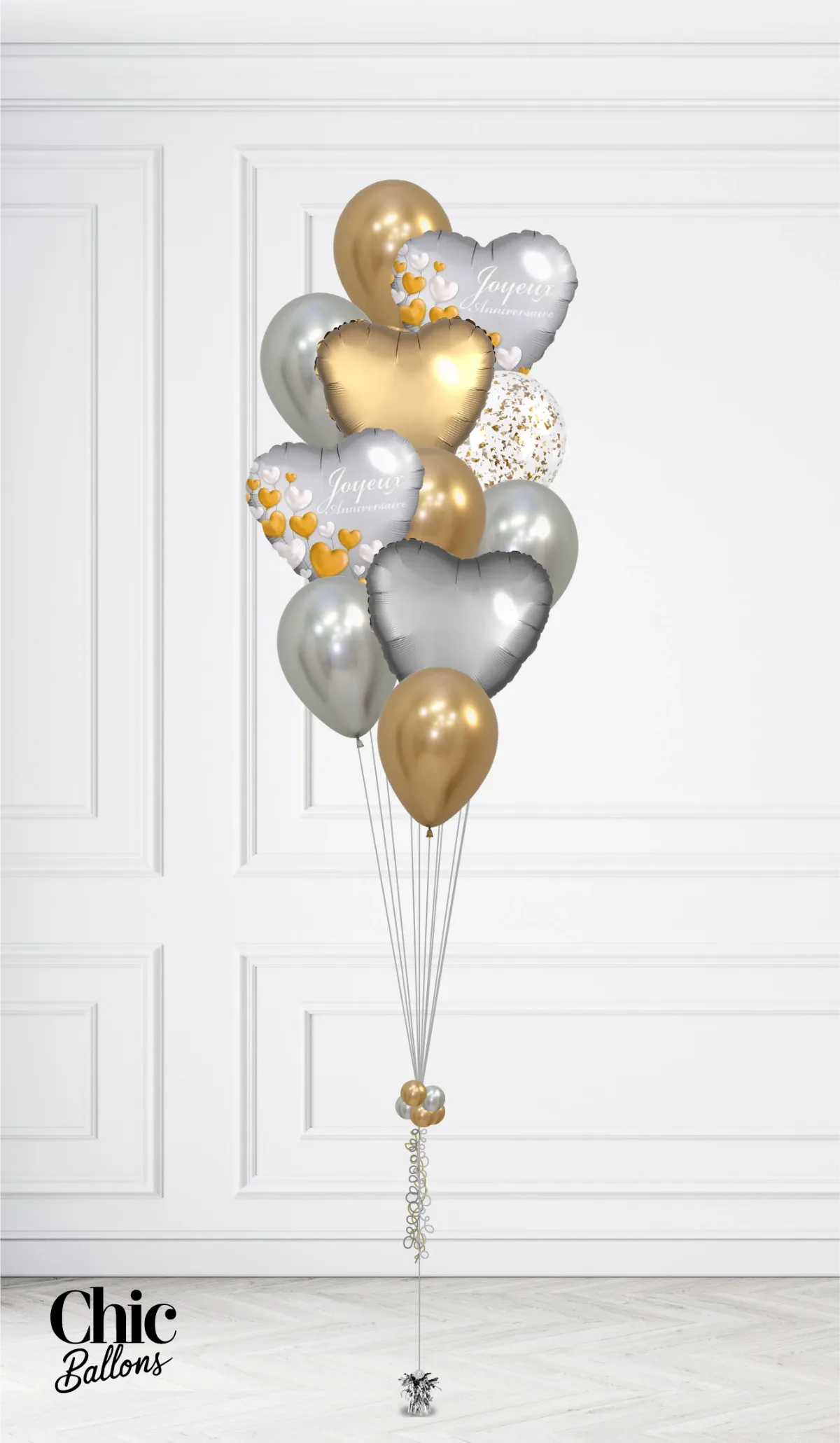 Bouquet de ballons - Bonne fête avec coeurs - Or et argent
