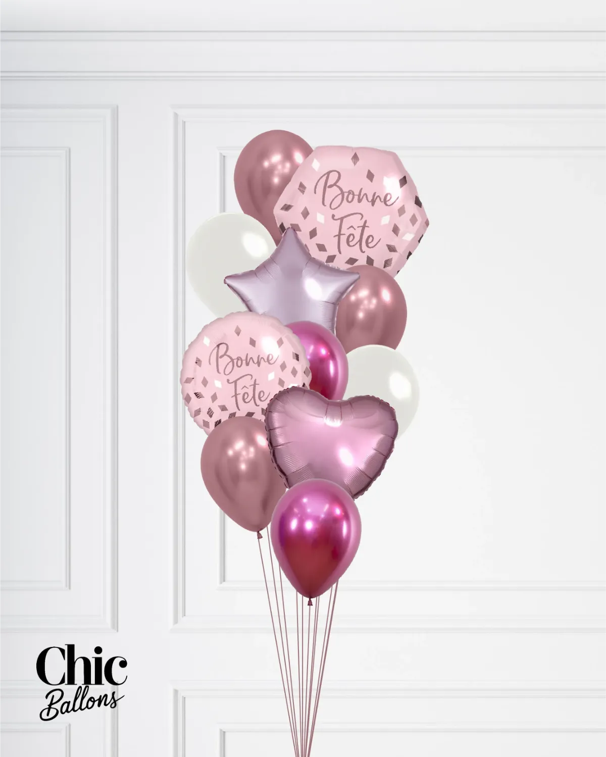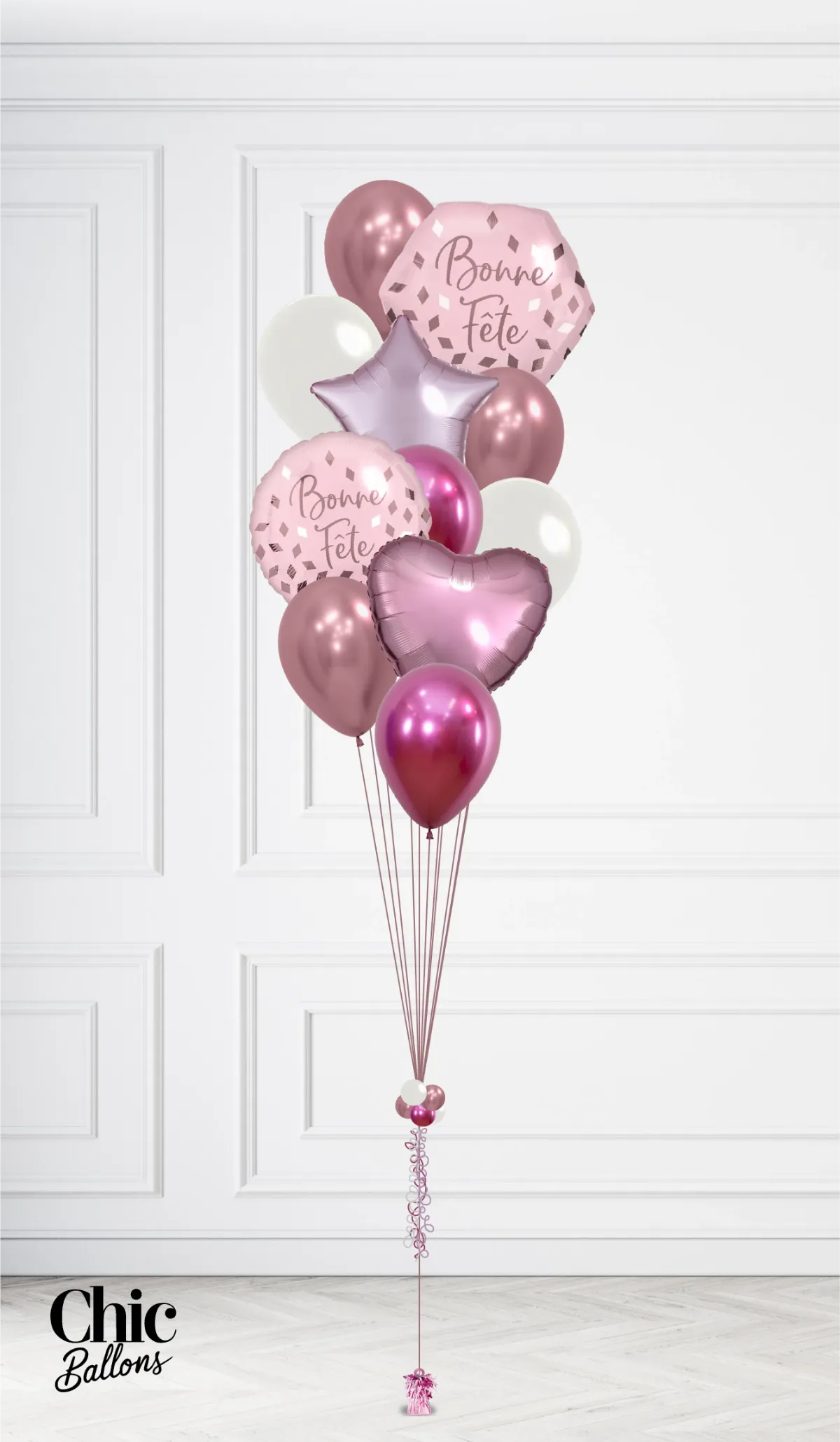 Faites briller l'occasion avec un bouquet rose gold élégant et festif ! Ce bouquet est composé d'un ballon 18" "Bonne fête" et d'un ballon hexagonal plus grand avec l'inscription "Bonne fête", le tout dans les teintes magnifiques de rose, rose gold et fuchsia. Un mélange parfait de couleurs raffinées pour célébrer en beauté. Vérifiez ce qui est inclus ou non dans chaque taille de bouquet.