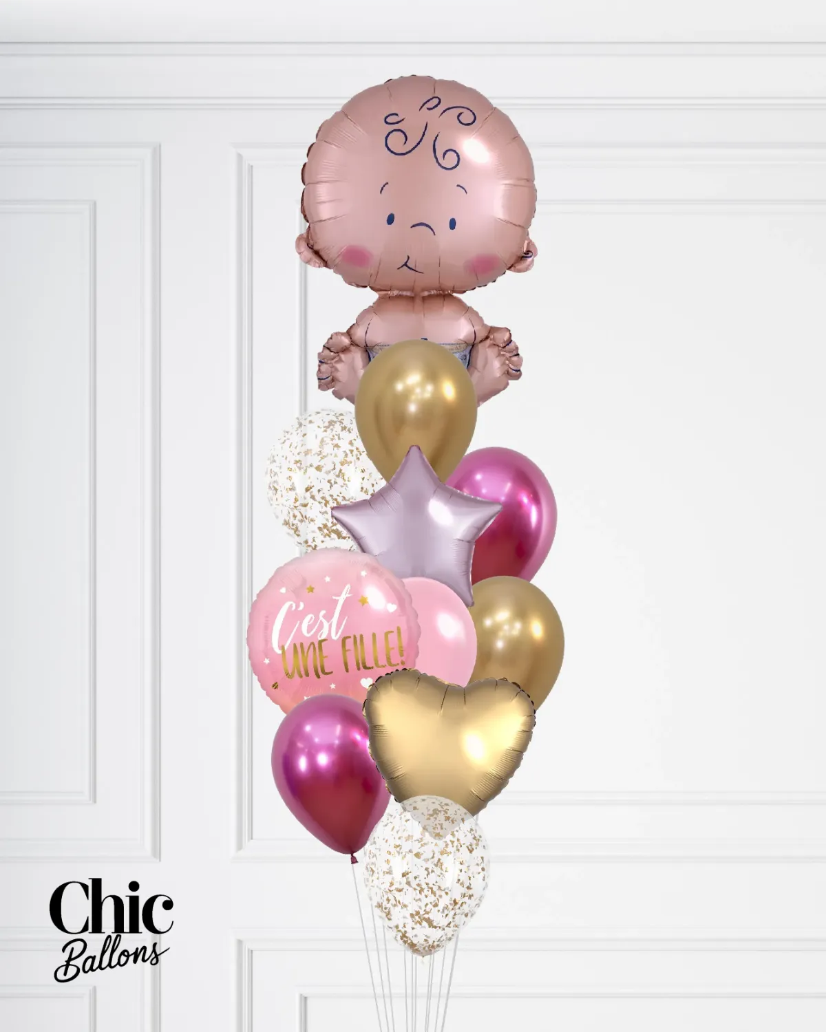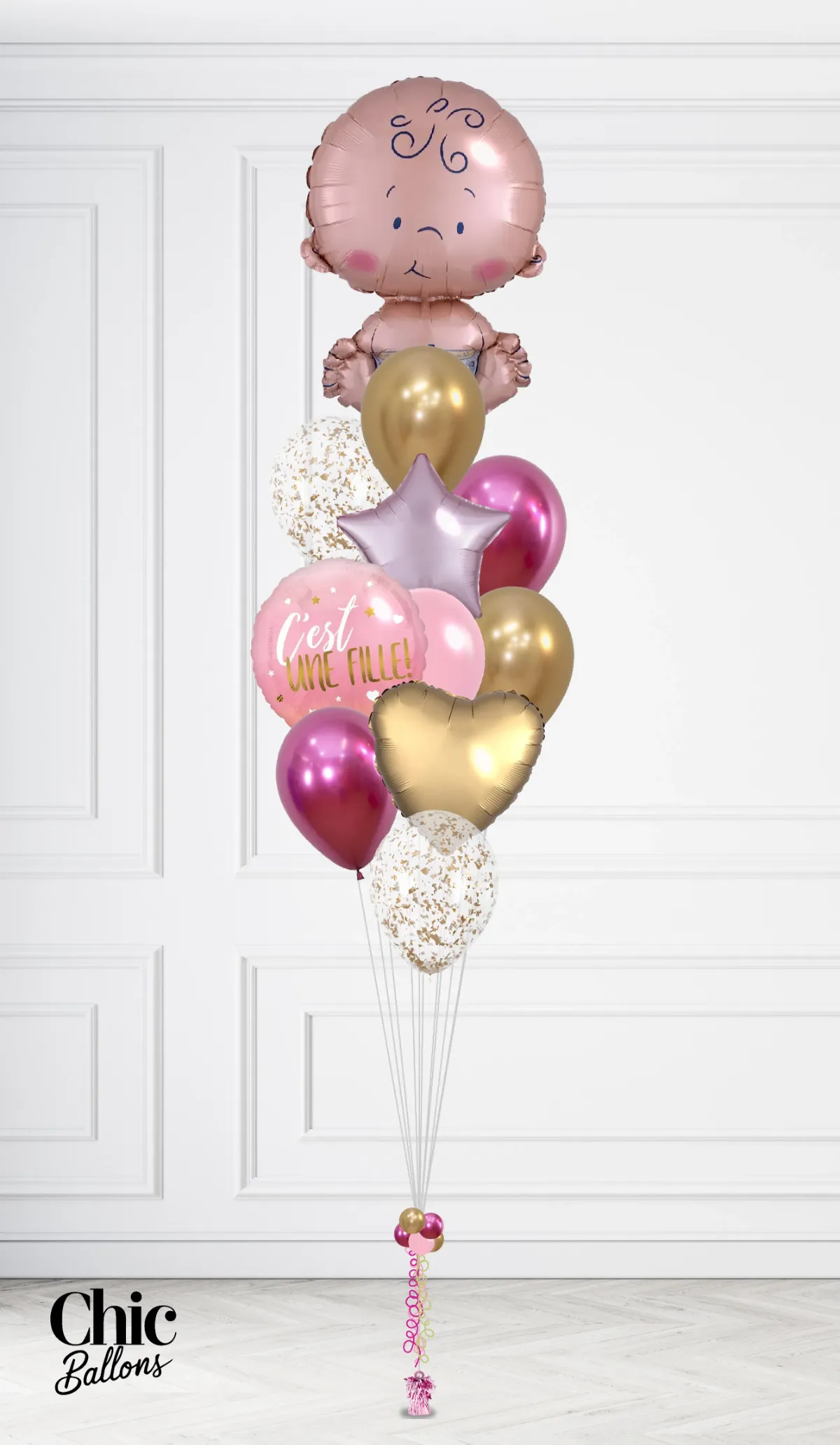 Célébrez l'arrivée de la petite princesse avec ce bouquet de ballons délicat et charmant ! Selon la taille sélectionnée, il peut inclure un gros ballon bébé sur le dessus, accompagné d'un ballon 18" écrit "C'est une fille". Ce bouquet est composé de teintes douces de rose, avec des touches de paillette rose et or pour une touche d'élégance. Parfait pour annoncer la bonne nouvelle ou décorer la fête de bienvenue ! Vérifiez ce qui est inclus ou non dans chaque taille de bouquet.