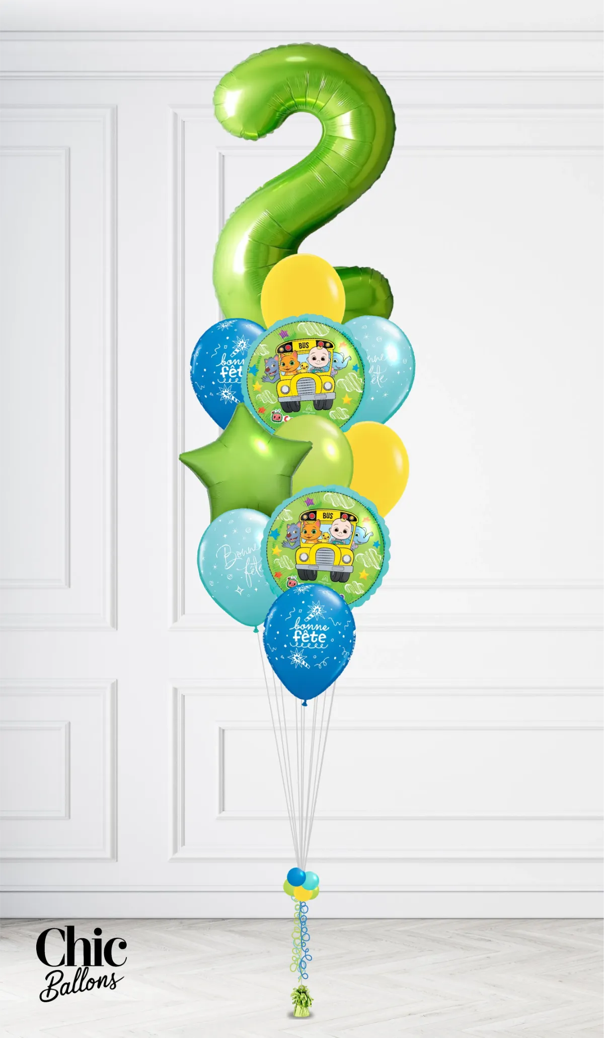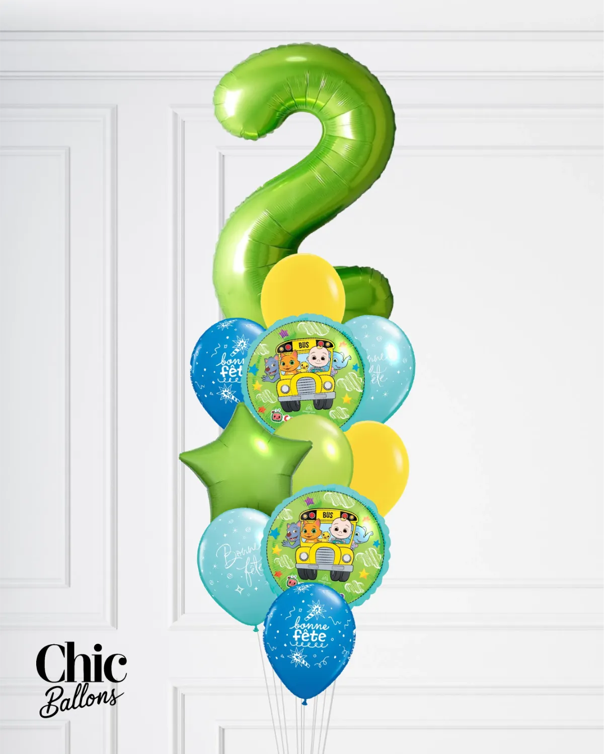 Ajoutez de la magie à votre célébration avec ce bouquet Cocomelon dans les teintes vert lime, jaune et bleu ! Selon la taille sélectionnée, il peut inclure un gros chiffre vert lime de 34", ainsi que deux ballons 18" Cocomelon et des étoiles 18" jaune et verte lime. Ce bouquet lumineux et joyeux apportera une touche festive et colorée à votre événement. Vérifiez ce qui est inclus ou non dans chaque taille de bouquet.
