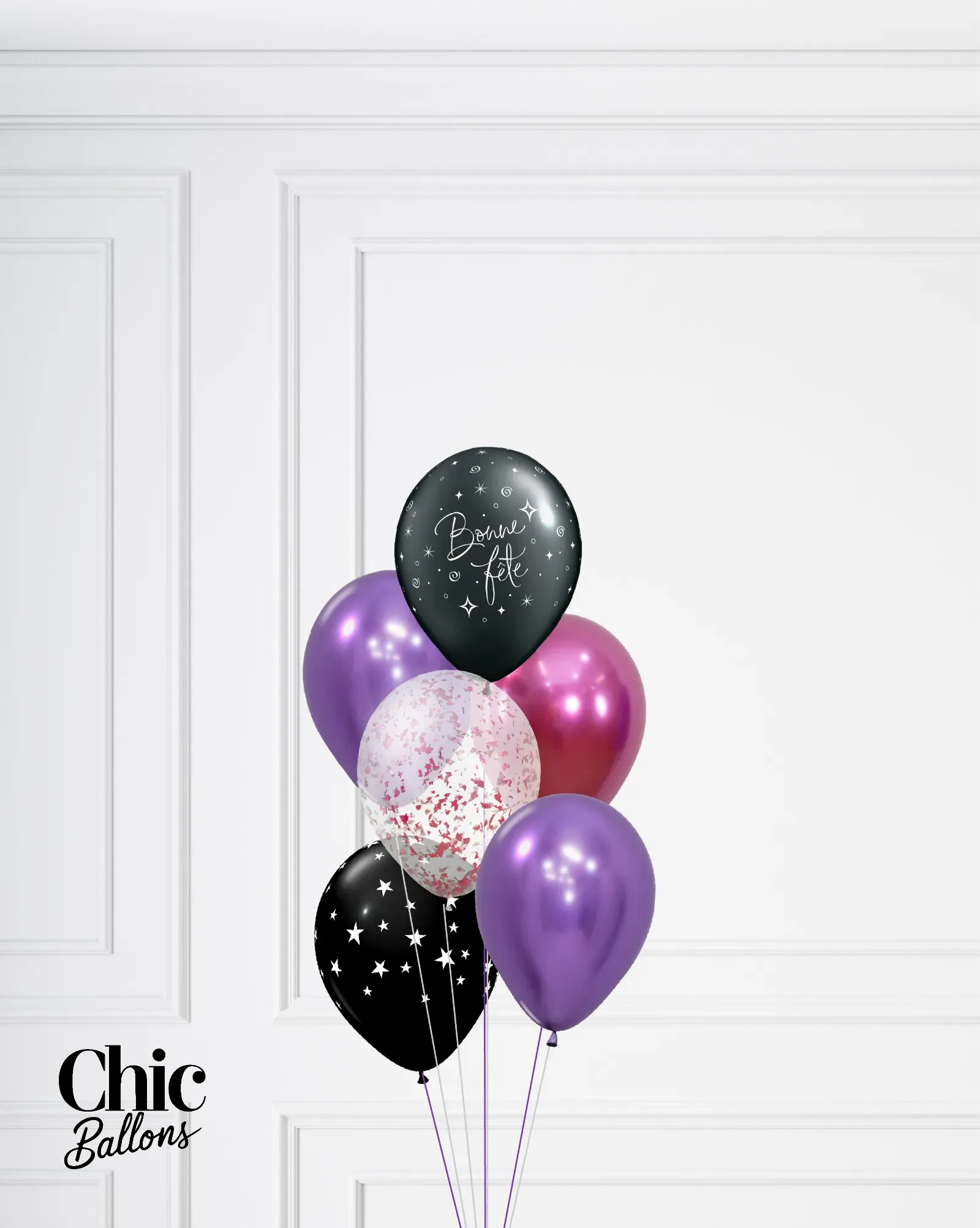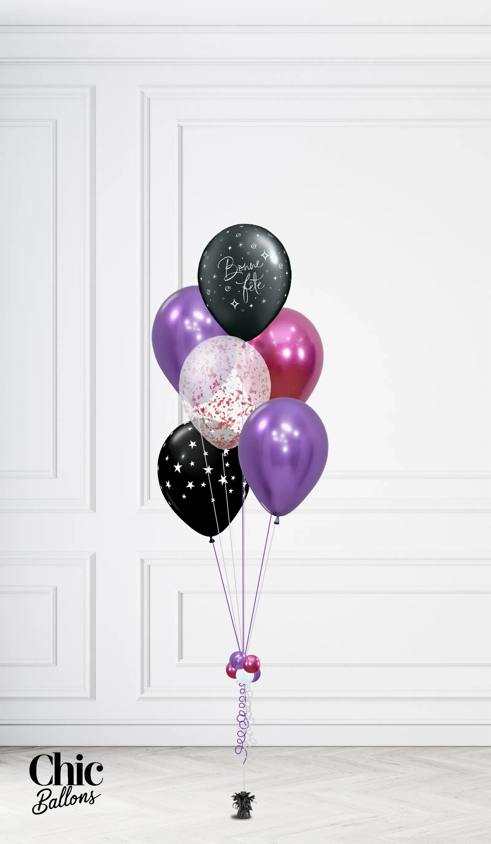 Bouquet de 5 ballons - Fushia, violet, noir et confettis