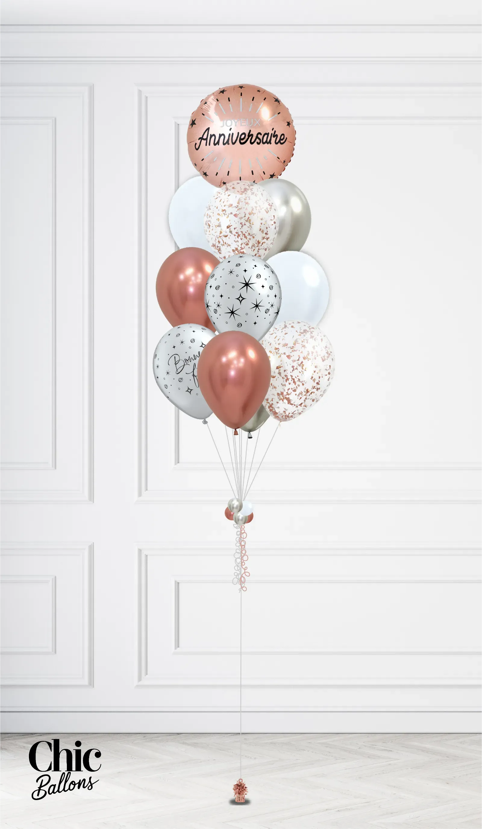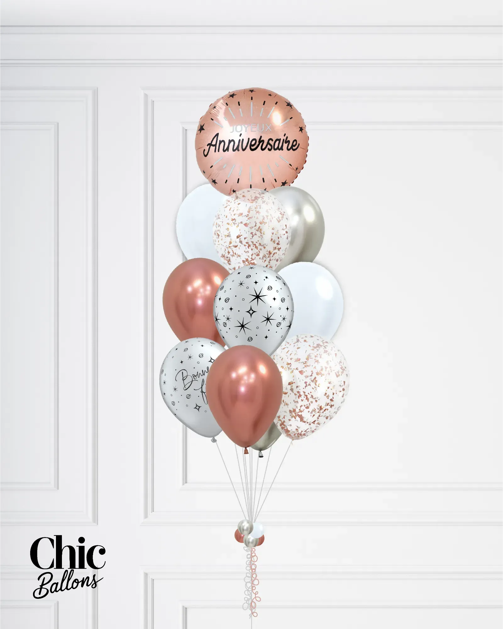 Bouquet de 12 ballons - Rosegold, blanc, argent et confettis
