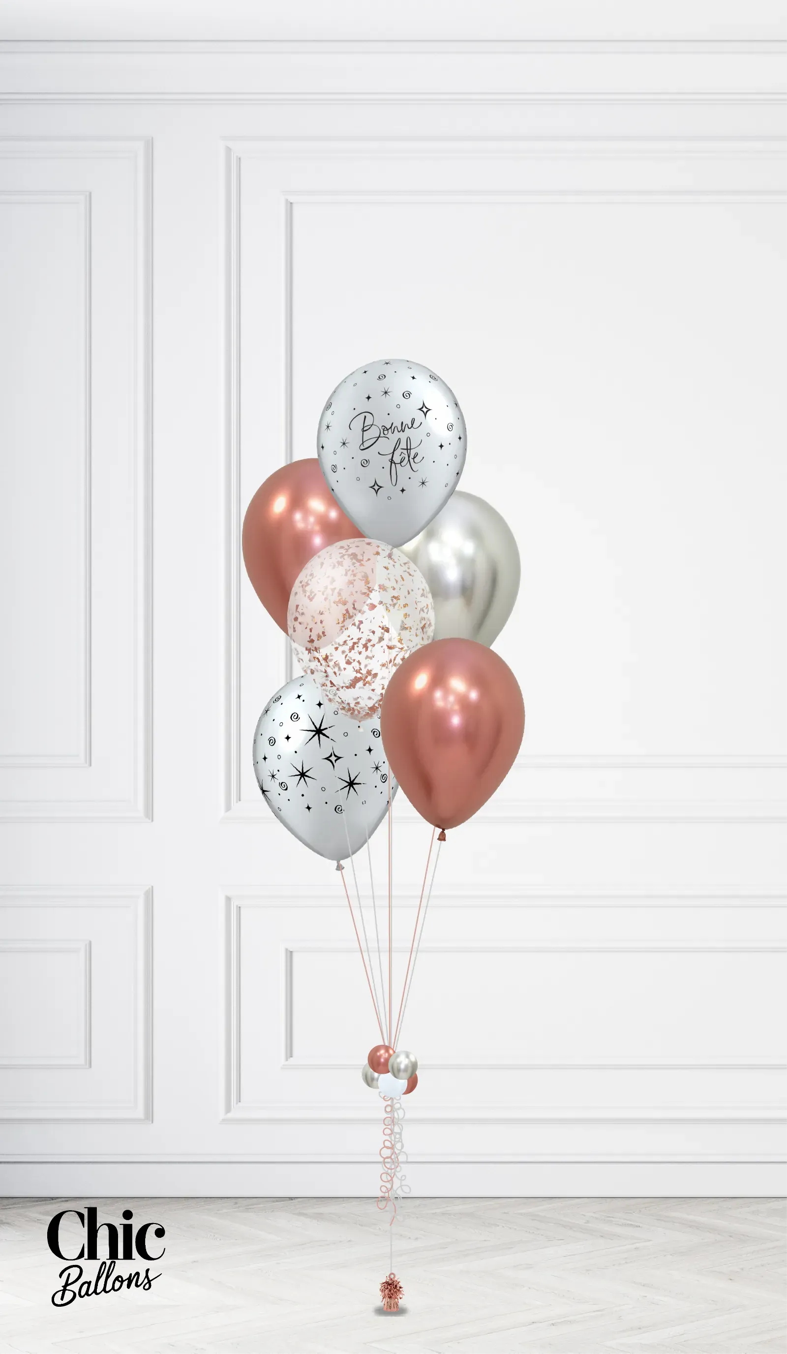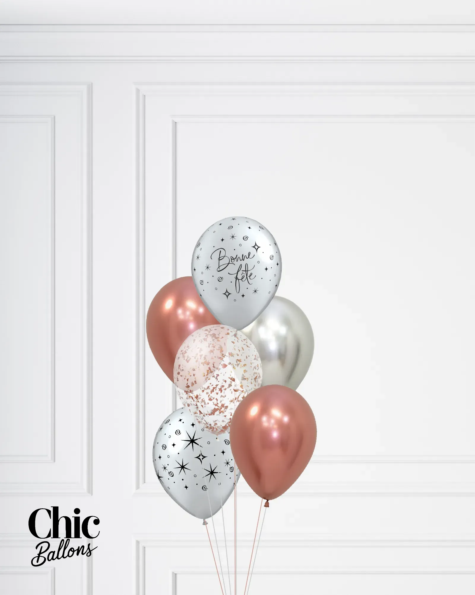 Bouquet de 5 ballons - Rosegold, blanc, argent et confettis