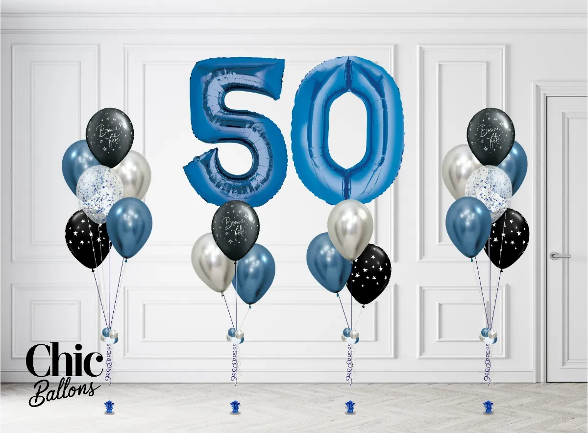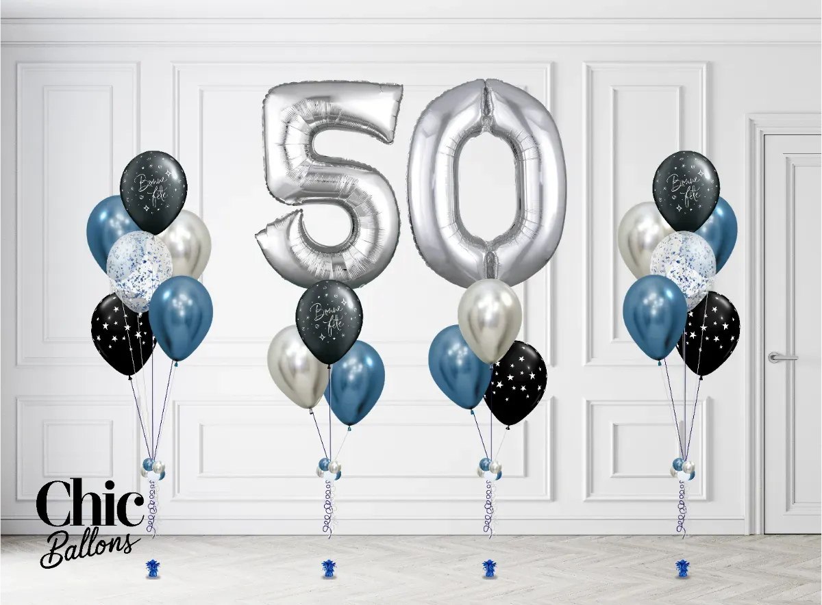 Ajoutez une touche spectaculaire à votre événement avec cet ensemble de 4 bouquets de ballons parfaitement coordonnés. Il comprend deux bouquets de 5 ballons dans des teintes élégantes de bleu métallisé, argent et noir, chacun rehaussé d’un ballon à paillettes bleu scintillant. À cela s’ajoutent deux bouquets avec des chiffres de votre choix, chacun accompagné de 3 ballons latex assortis dans les mêmes teintes. Un choix idéal pour une célébration chic et mémorable !