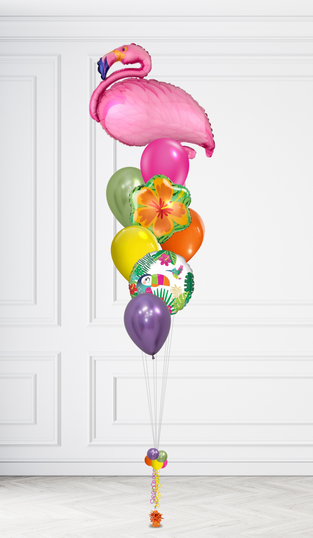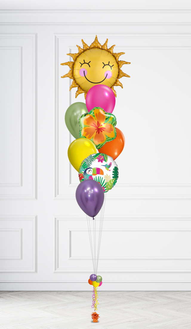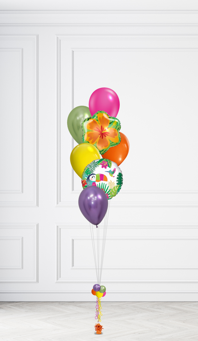 Ajoutez une touche exotique à votre fête avec notre bouquet de ballons colorés inspiré des vacances sous les tropiques ! Composé de ballons jaunes, oranges, verts, violets et fuchsia, ce bouquet festif est agrémenté de motifs d’hibiscus et de pélicans tropicaux. Pour un effet encore plus spectaculaire, optez pour la version grand format avec perroquet, soleil ou flamant rose géant. Vérifiez ce qui est inclus ou non dans chaque taille de bouquet.