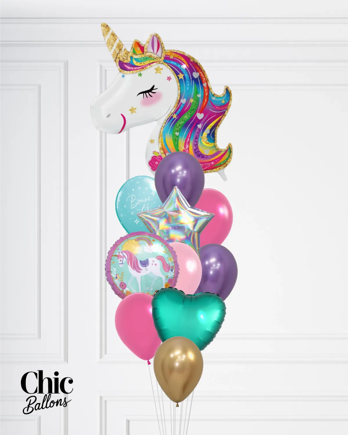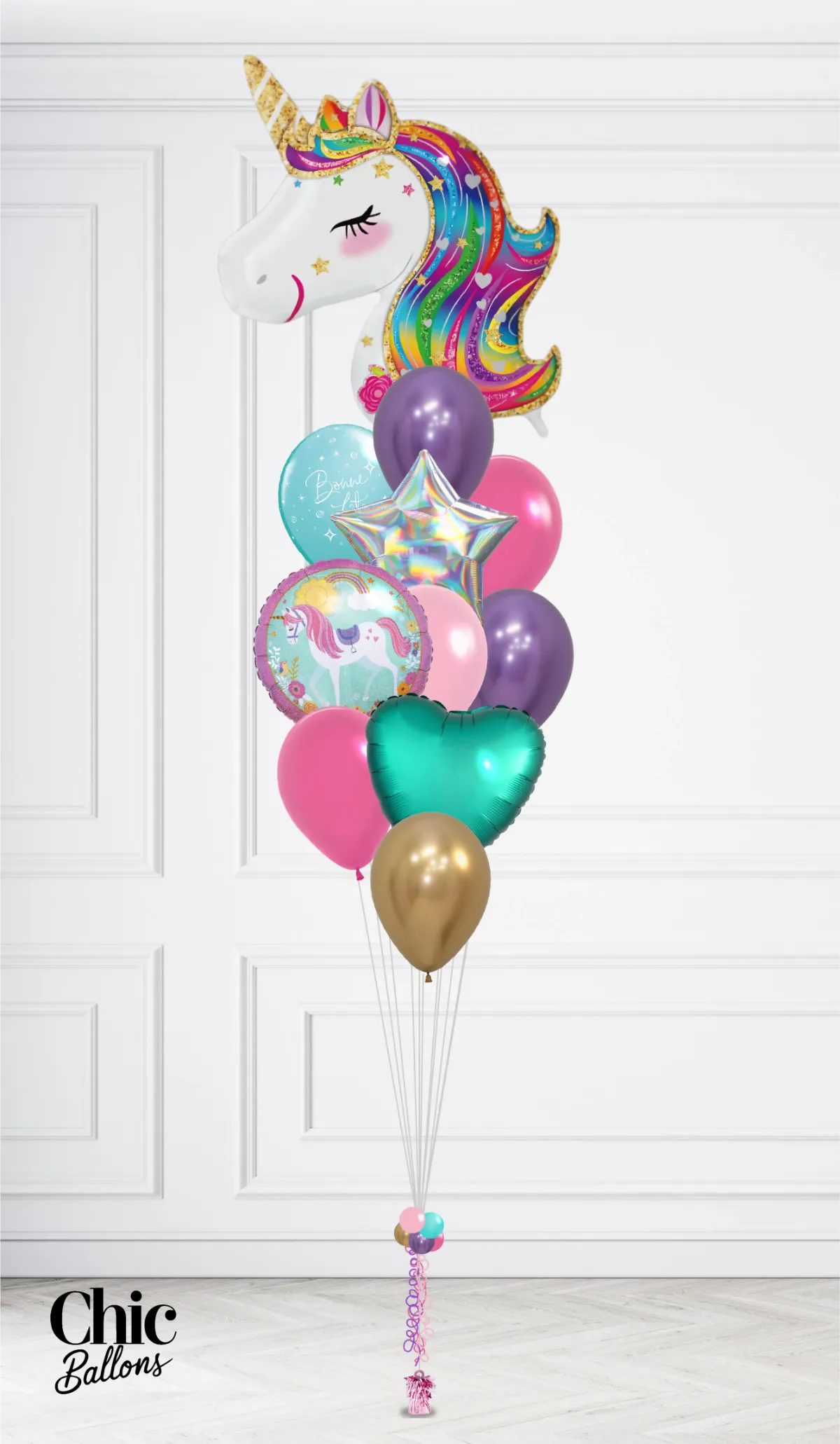 Ajoutez une touche magique à votre événement avec notre bouquet Licorne ! Selon la taille sélectionnée, il peut y avoir un gros ballon de licorne colorée dans les teintes de turquoise, rose et violet, accompagné d'un ballon licorne, d'une étoile iridescente, et d’une touche de doré. Ce bouquet enchanteur apportera une ambiance féerique et joyeuse à votre célébration ! Vérifiez ce qui est inclus ou non dans chaque taille de bouquet.