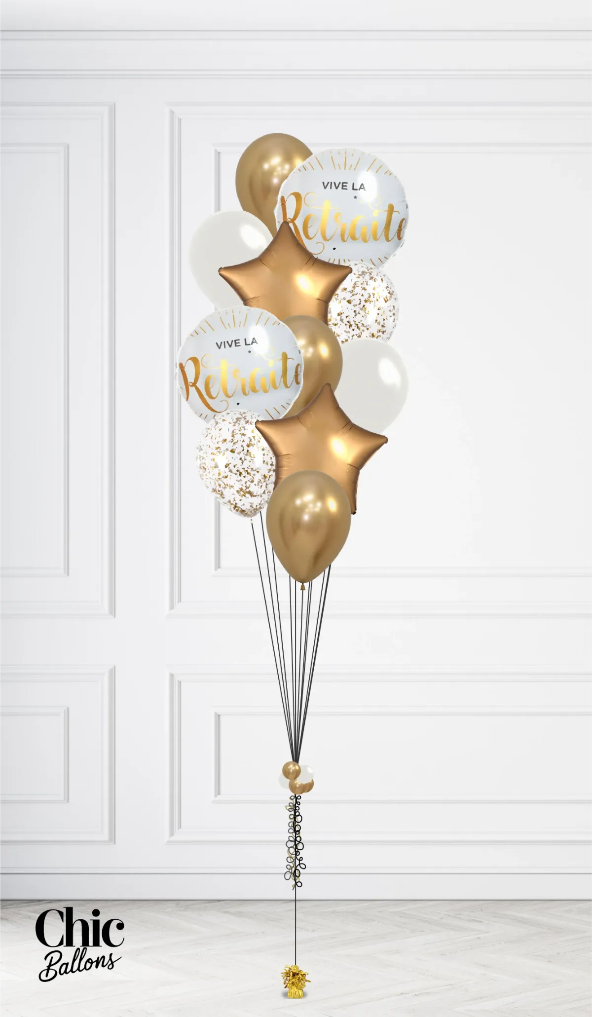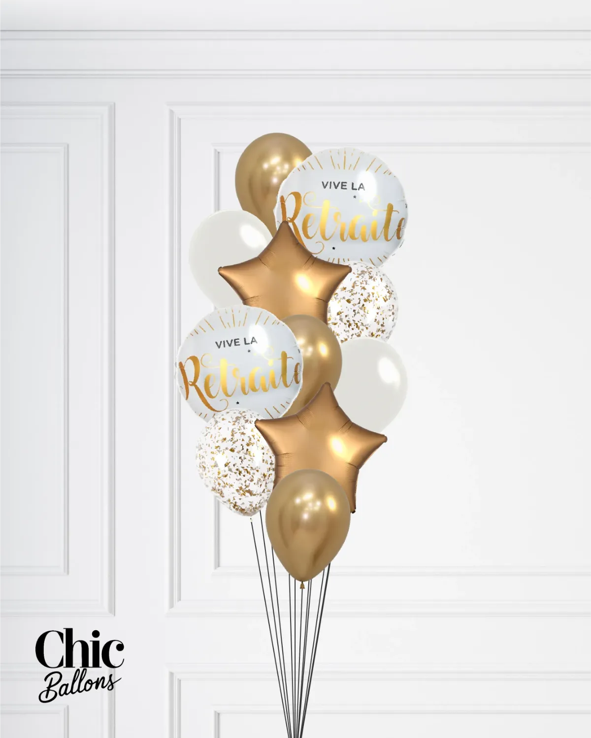 Célébrez l'arrivée d'une nouvelle aventure avec un bouquet éclatant de ballons or et blanc ! Ce bouquet de retraite chic et élégant est composé de 2 ballons 18" "Vive la retraite" dans les teintes d'or et blanc, mettant en avant un message joyeux et festif pour marquer cette étape importante. Vérifiez ce qui est inclus ou non dans chaque taille de bouquet.