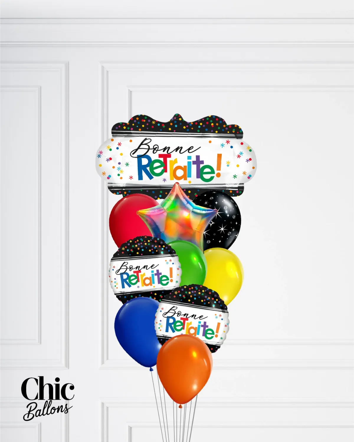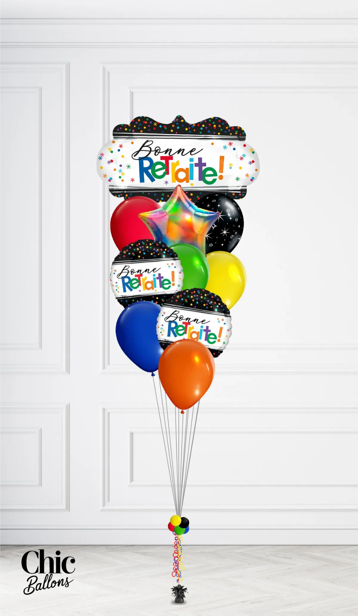 Célébrez le départ en retraite avec style et éclat ! Ce bouquet coloré est conçu pour apporter une touche chic et vibrante à cette occasion spéciale. Il inclut 2 ballons "Bonne retraite" pour exprimer les vœux de départ et un gros ballon "Bonne retraite" sur le dessus pour ajouter un message fort et mémorable. Le tout est complété par une étoile arc-en-ciel iridescente, apportant une touche de magie et de luminosité à ce bouquet. Le contraste du noir et des couleurs vives crée une ambiance à la fois élégante et festive, parfaite pour marquer ce grand moment. Vérifiez ce qui est inclus ou non dans chaque taille de bouquet.