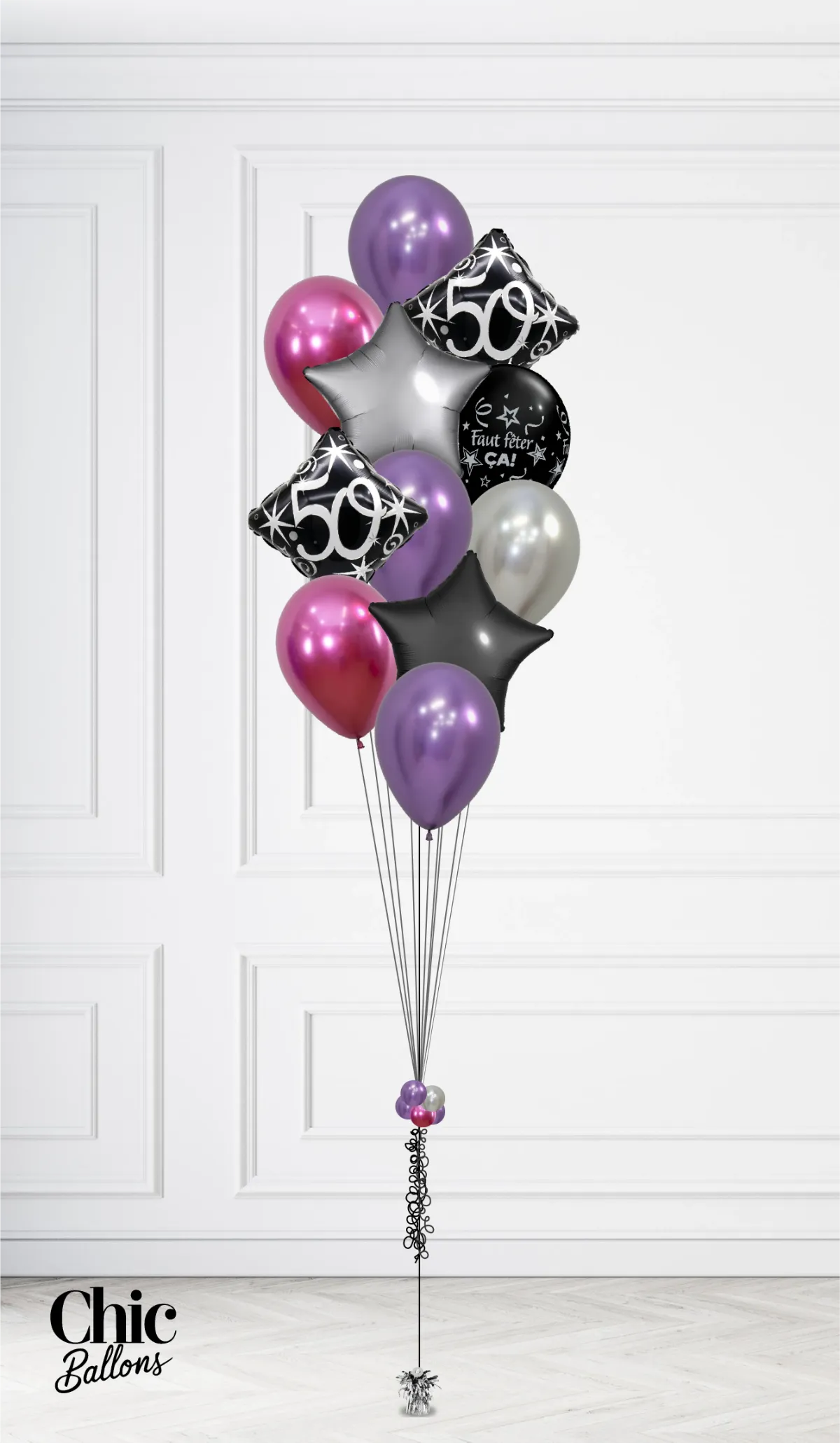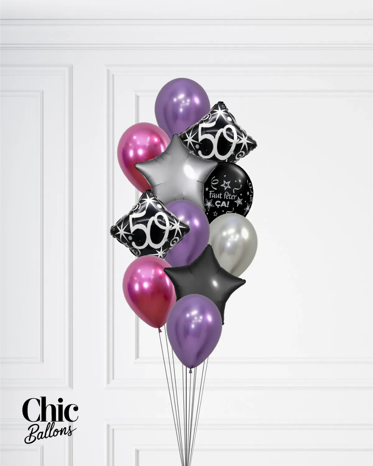 Apportez une touche élégante à votre fête avec ce bouquet moderne aux teintes métalliques de fuchsia, violet et argent. Selon la taille sélectionnée, il peut inclure deux ballons avec l'âge de votre choix parmi 18, 30, 40, 50, 60, 70, 80 ans ou un ballon "Bonne fête", ainsi qu’une étoile argent métallisée de 18" et une étoile fuchsia. Ce bouquet apportera à votre événement une ambiance festive et sophistiquée. Vérifiez ce qui est inclus ou non dans chaque taille de bouquet.