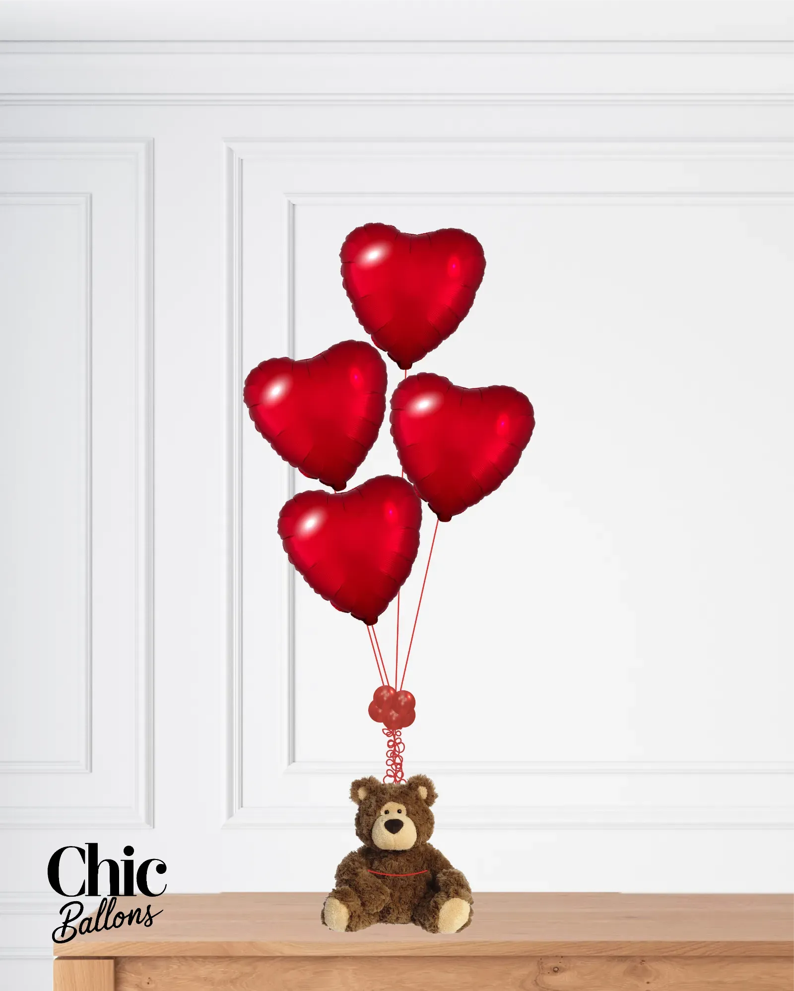 Bouquet de Saint-Valentin - 4 ballons et ourson brun