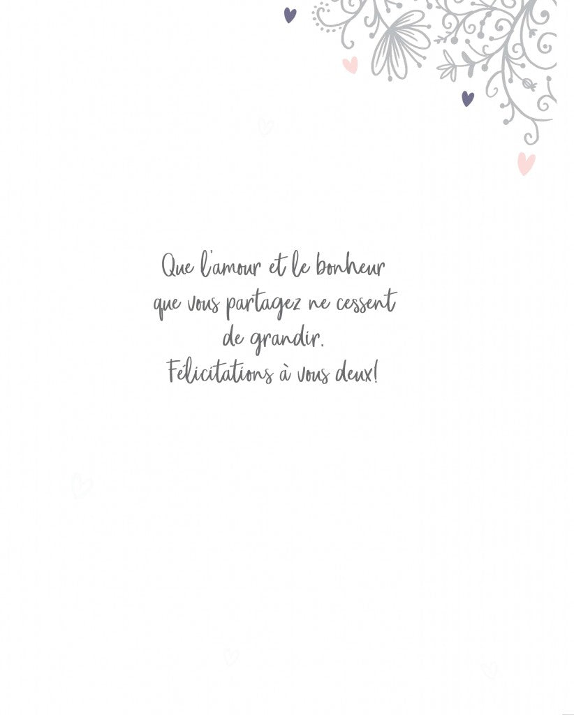 TEXTE À L’INTÉRIEUR: QUE L’AMOUR ET LE BONHEUR QUE VOUS PARTAGEZ NE CESSENT DE GRANDIR! FÉLICITATIONS À VOUS DEUX.