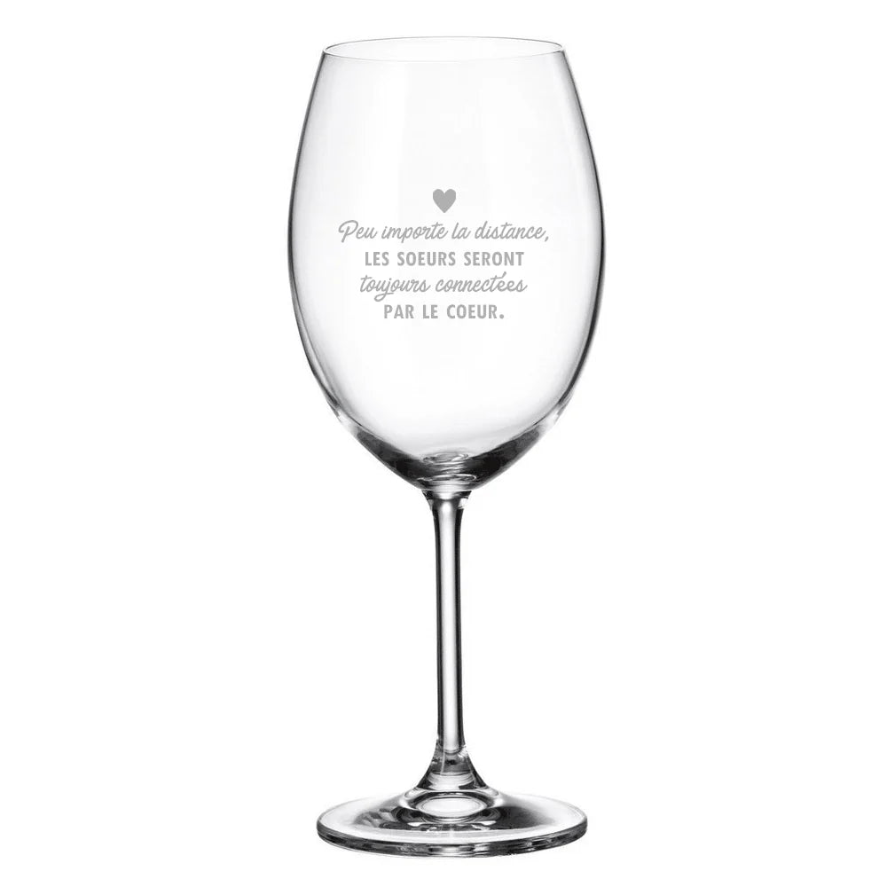 Coupe à vin avec l'inscription : Peu importe la distance, les soeurs seront toujours connectés par le coeur.